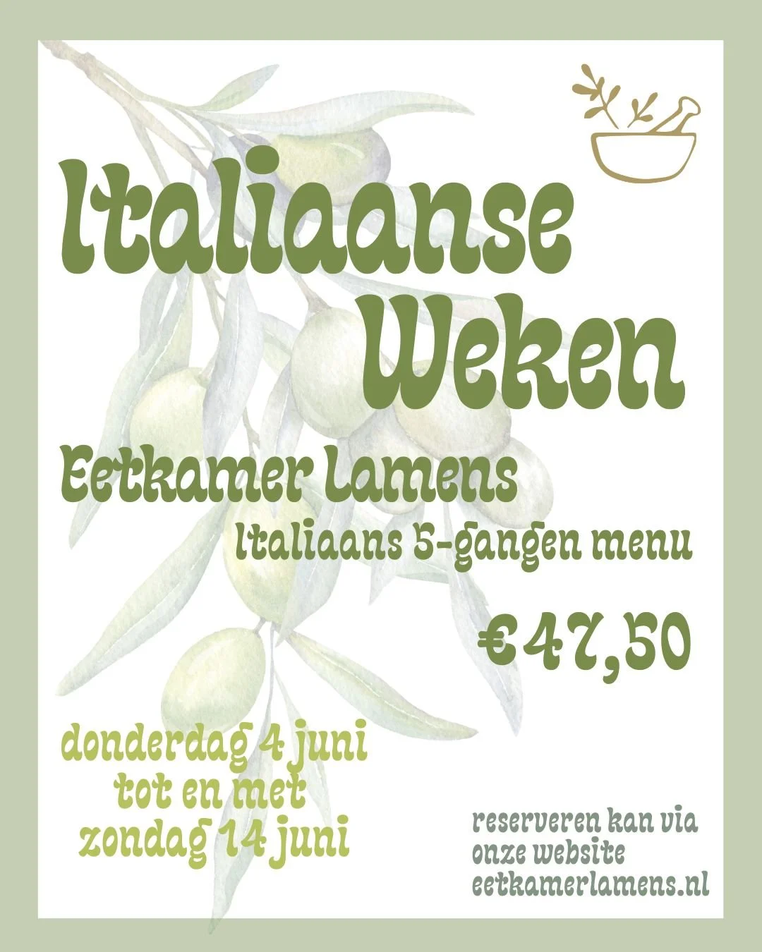 Van donderdag 4 juni tot en met zondag 14 juni serveren we een 5-gangen Italiaans menu voor €47,50.